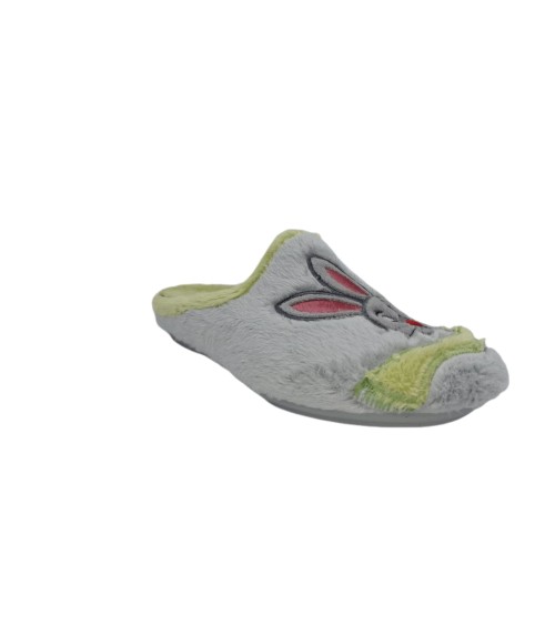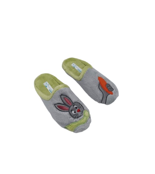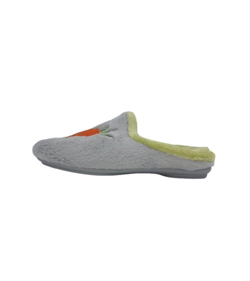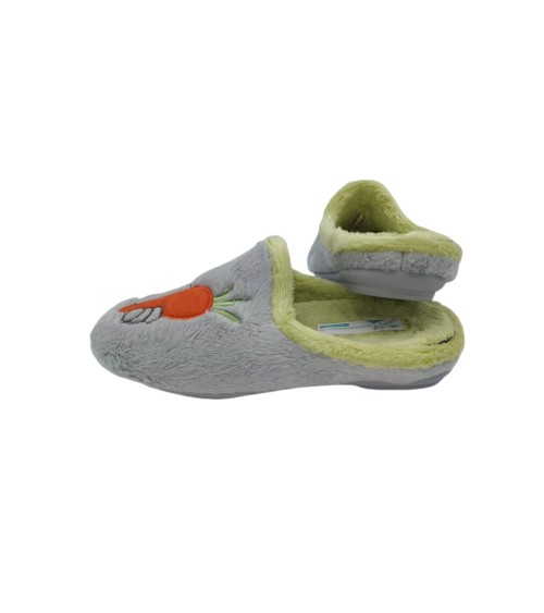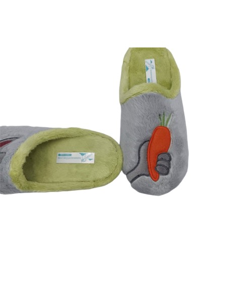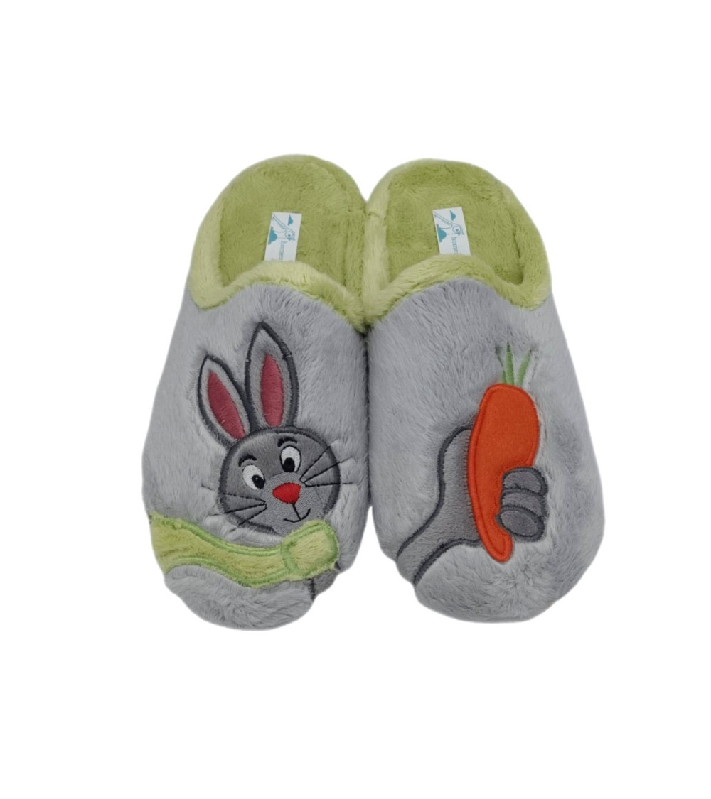 Zapatilla descalza con dibujo del conejo y la zanahorio sobre fondo de suapel gris. Está forrada de suapel en color pistacho, un tejido muy suave al tacto y calentito. Plantilla extraíble acolchada en forma de cuña. La suela es de caucho antideslizante y flexible.