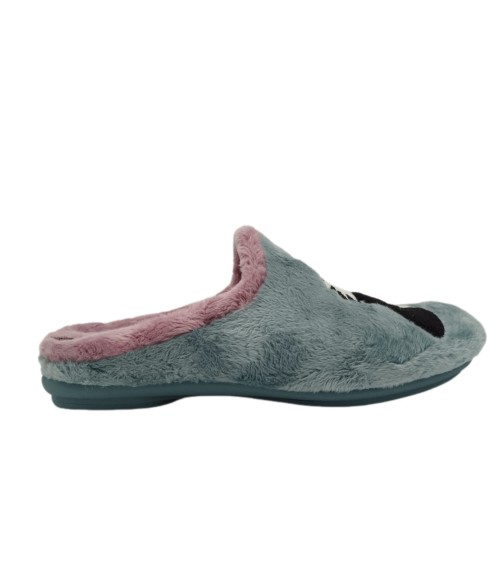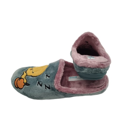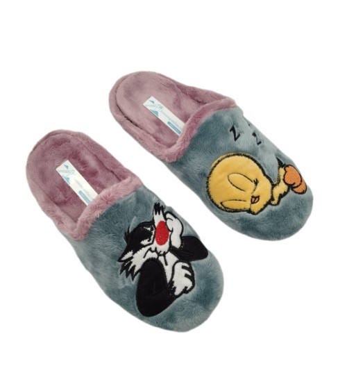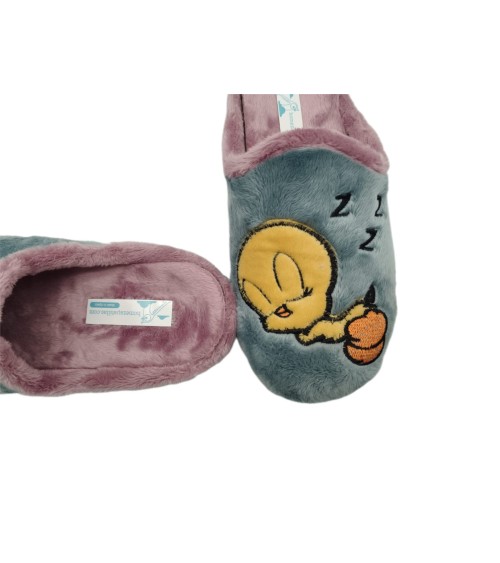 Zapatilla de suapel turquesa con dibujos de Piolín y Silvestre combinados, plantilla de suapel extraíble y forrada en suapel rosa. Suela de caucho antideslizante y flexible. Perfectas para días de invierno.