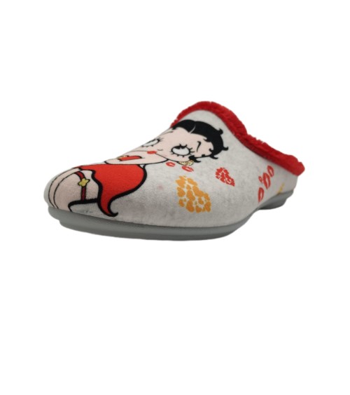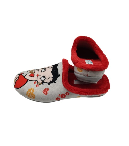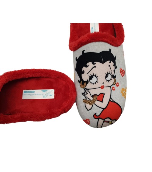 Zapatilla descalza con estampado de Betty Boop sobre fondo gris, ribete de suapel rojo, plantilla extraíble del mismo tejido y color. Suela de caucho antideslizante y flexible.