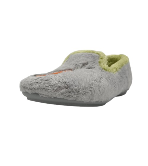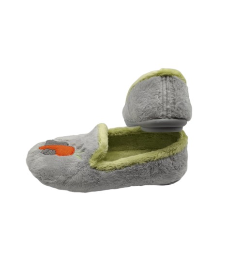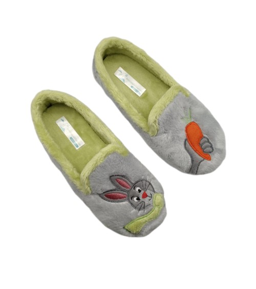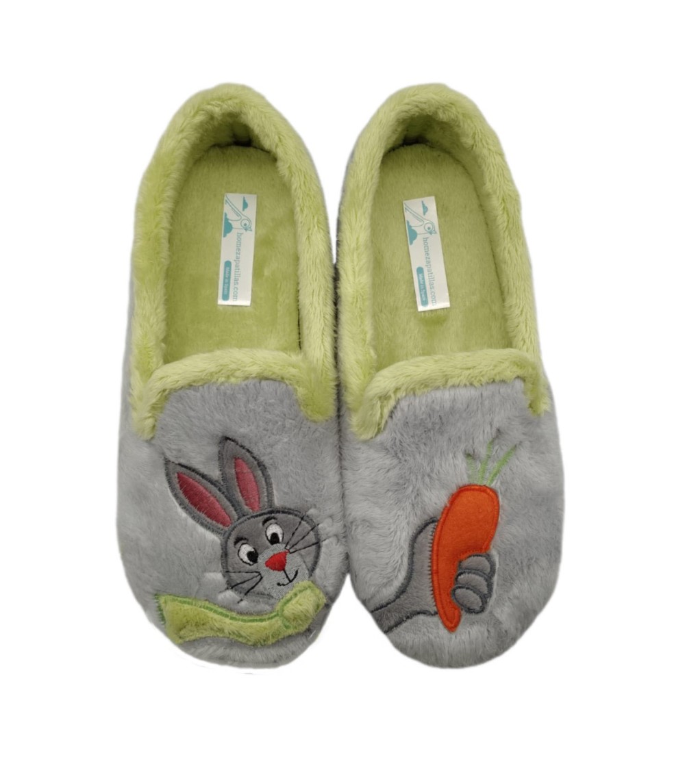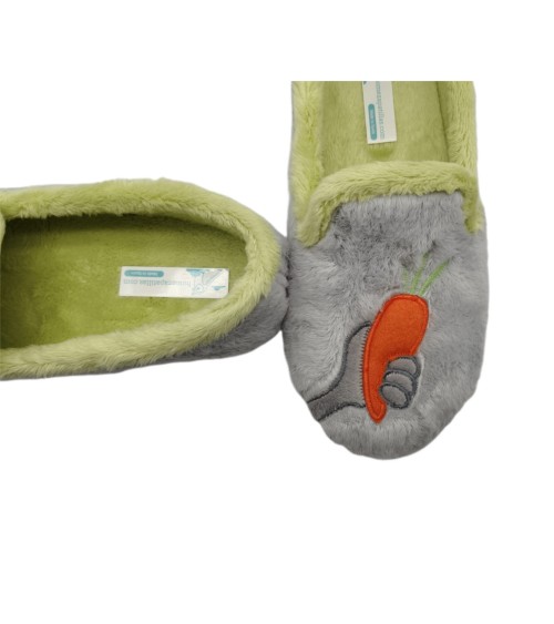 Zapatilla de casa cerrada en tono gris con estampado de conejo y zanahora combinados, ribete de suapel en color pistacho y plantilla extraíble en el mismo tono. Suela de caucho antidelizante y flexible.