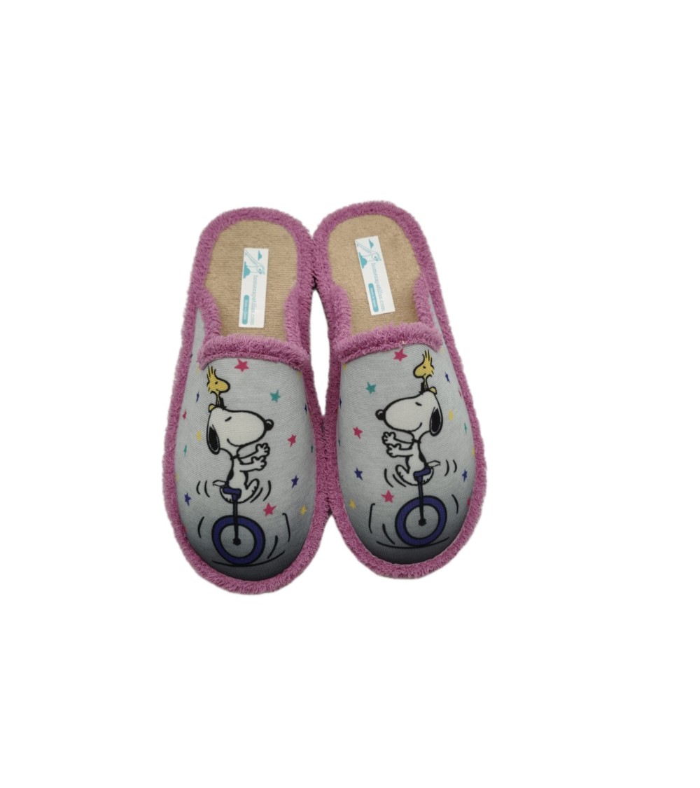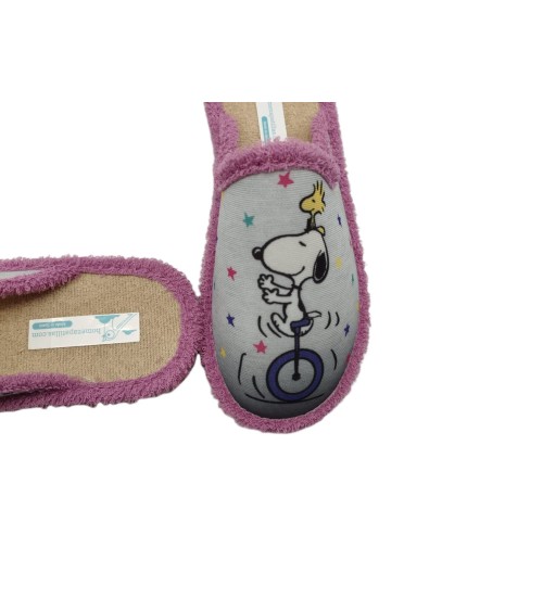 Zapatilla descalza con una divertida imagen de Snoopy en movimiento sobre fondo gris y con borde lila, plantilla de rizo en todo beige. Suela eva microporosa muy ligera.