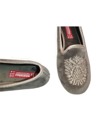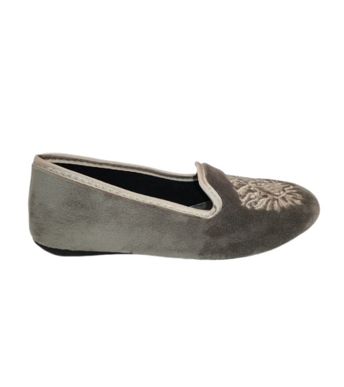 Zapatilla cerrada en forma de mocasin en color gris marengo con el dibujo de un escudo en la parte superior. Forro interior de suapel un tejido muy suave al tacto y calentito.. Suela de caucho antideslizante y flexible.
